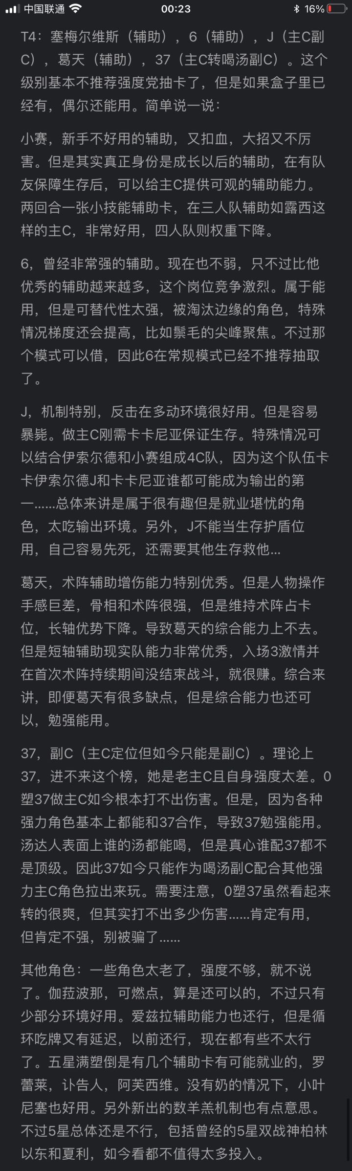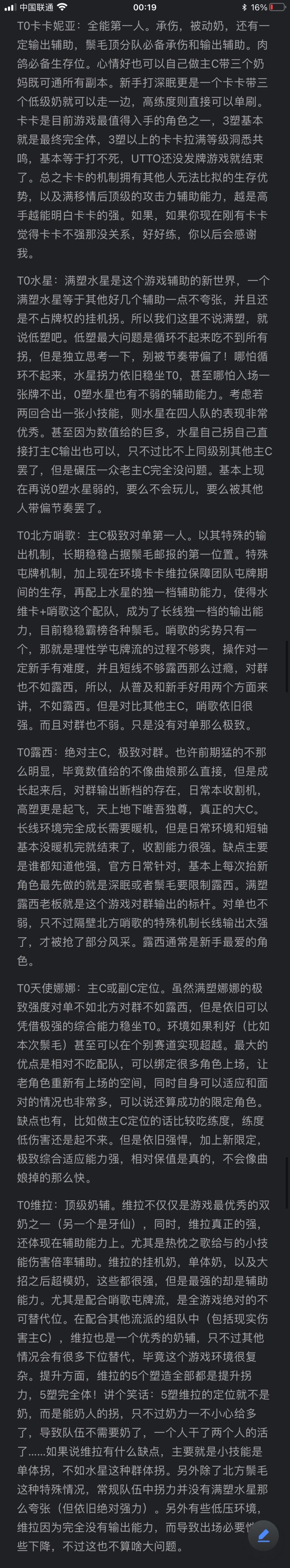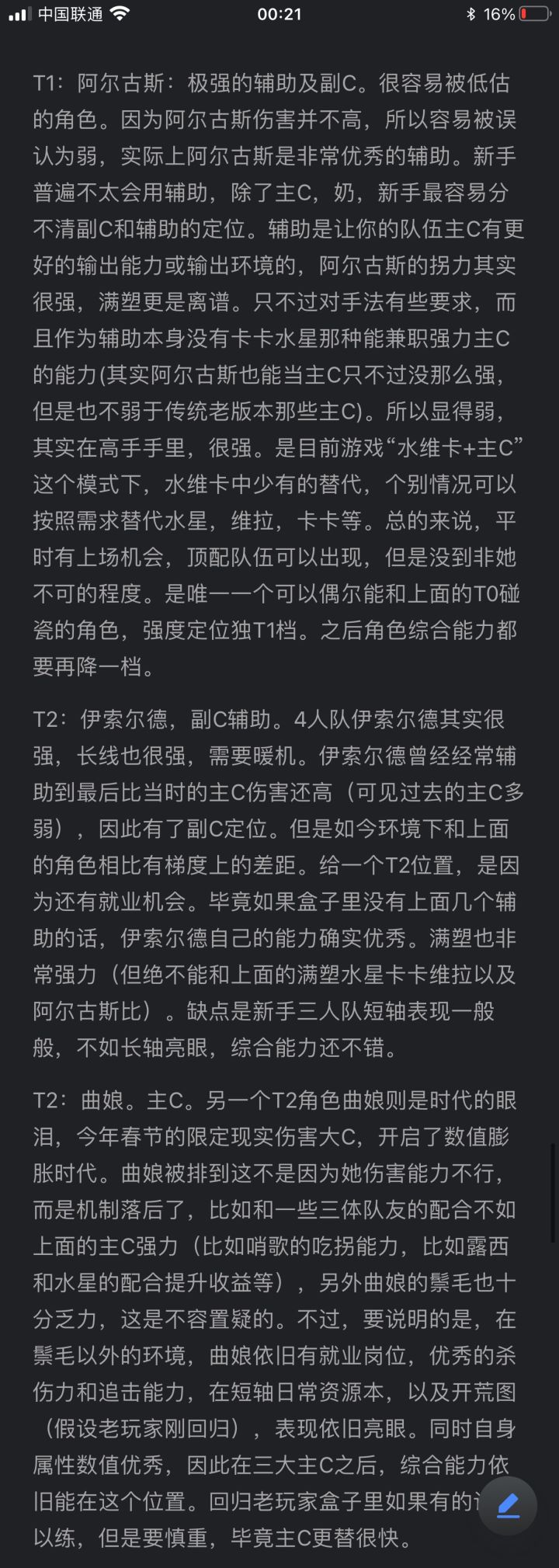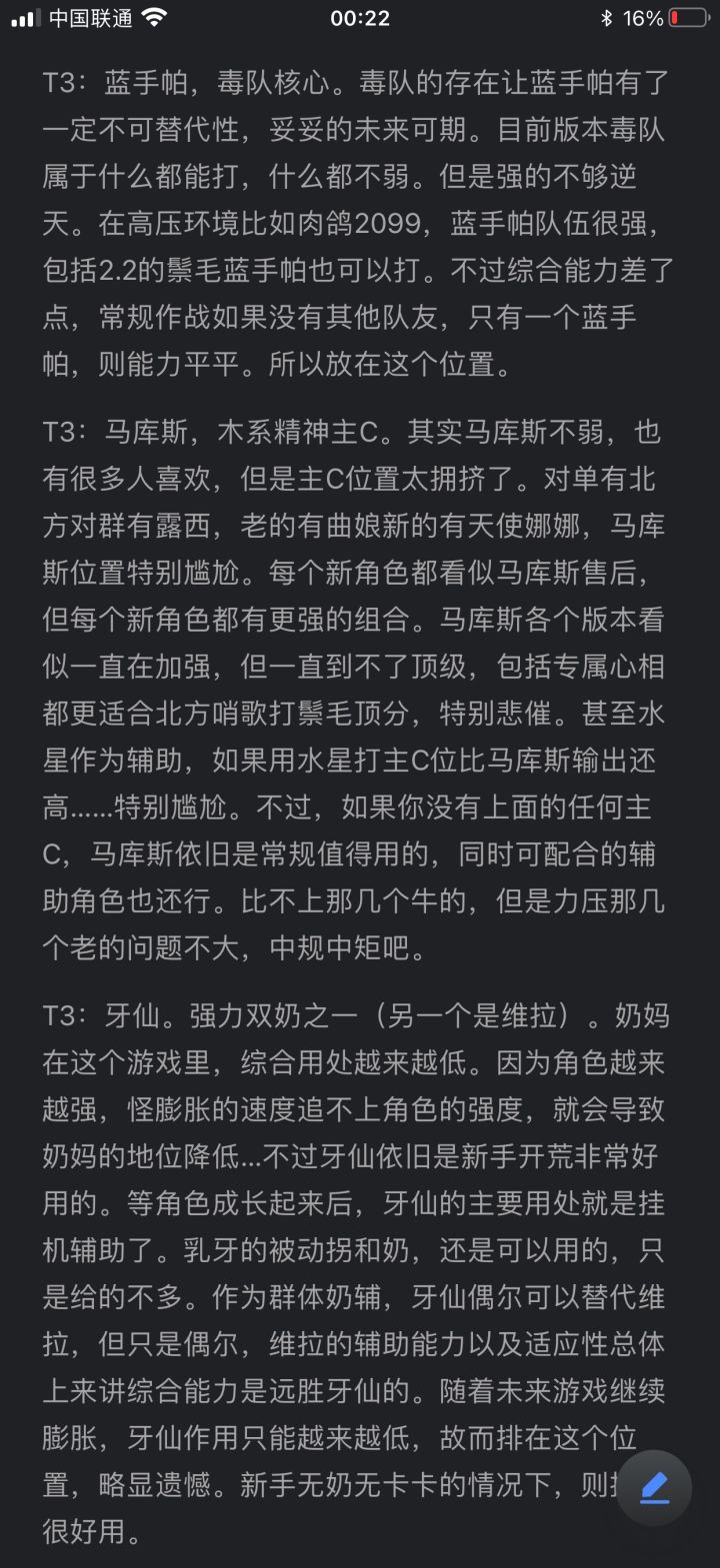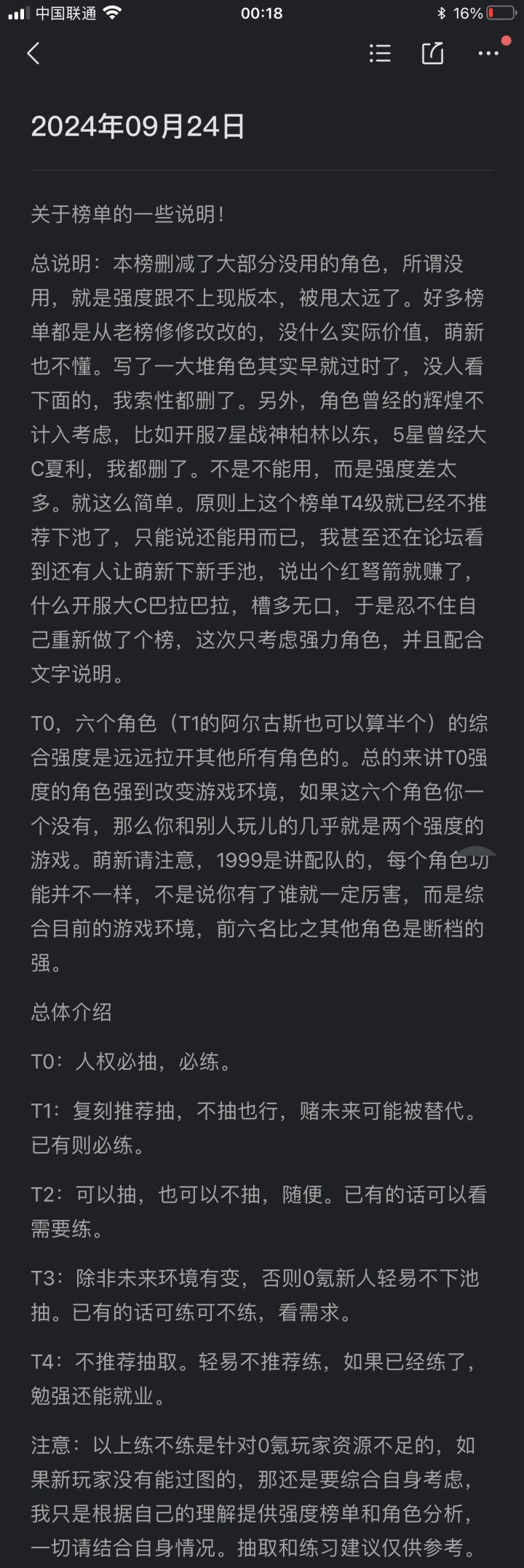前排提示!一共六张图!!后面5张是文字说明!!!点击可以查看长图!!!!关于榜单,个人所做,和常规论坛上看到的梯度划分会有不同。虽然图片里说了,但是这里还再重复一遍。以免懒人不看。总说明:本榜删减了大部分没用的角色,所谓没用,就是强度跟不上现版本,被甩太远了。好多榜单都是从老榜修修改改的,没什么实际价值,萌新也不懂。写了一大堆角色其实早就过时了,没人看下面的,我索性都删了。另外,角色曾经