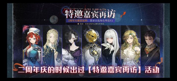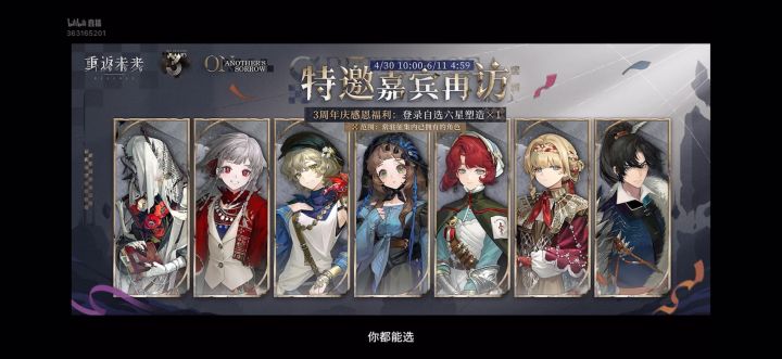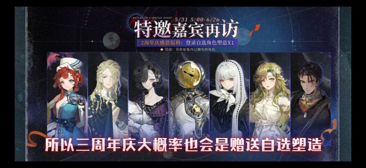 2周年庆的时候出过的活动 【特邀嘉宾再访】 可以登录就获取一个免费的自选角色塑造从福利只会越来越好这点出发 3周年庆大概率也是会有这个活动的 毕竟巡游版本的必New六星也是这样传承下去的所以如果不知道自己哪些角色比较适合选塑造的话可以互相交流起来了#重返未来人们向何处去 #重返未来1999 #重返未来1999攻略 #重返未来1999日常分享