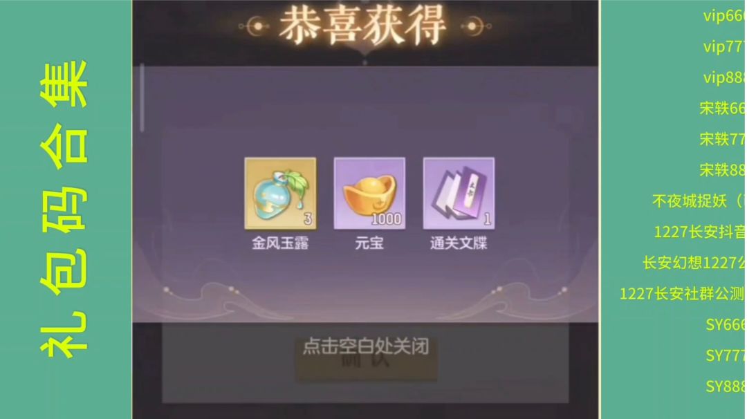 礼包码合集(实时更新): vip666、 vip777、 vip888、 宋轶666、 宋轶777、 宋轶888、 长安幻想1227公众号福利、 1227长安抖音公测礼、 SY666、 SY777、 SY888、 不夜城捉妖(此已过期)、 1227长安社群公测礼(此也过期) (再有新的可用的我会补到这里,持续更新中…… 祝大家夏日清爽,游戏愉快!)#长安幻想夏日游记创作征集令#攻略