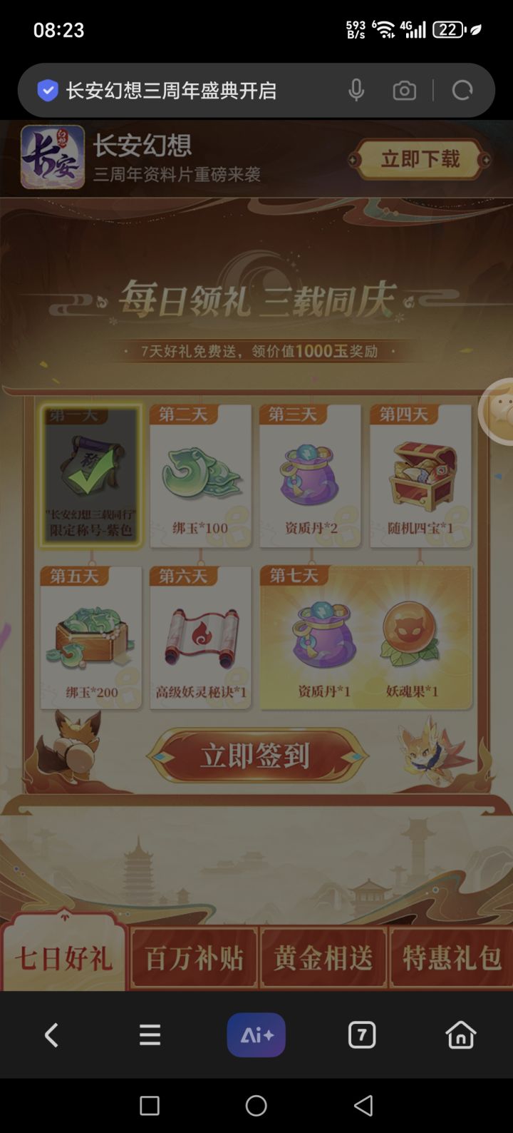 有签到奖励啥的#长安幻想 #长安幻想十万人争锋服 #长安幻想全民淘金 #长安幻想新区 #长安幻想蛇年新春版本 长安幻想三周年盛典开启,绑玉、资质丹、妖魂果免费领!还有稀有成就,黄金葫芦等你拿:https://m.sysl.cc/32h2QV4