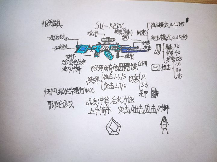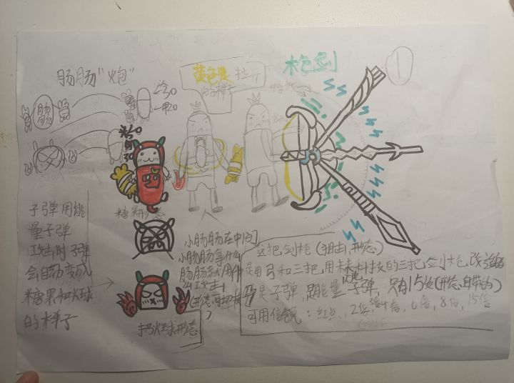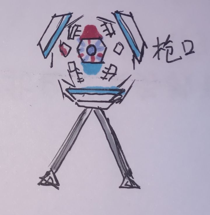 1.因为因为想到现在能量武器还没有手枪,所以我想了这一款,这只是个草图 所以画的不怎么好。枪身以黄色和蓝色为主,配件芯片是插在后面的,攻击方式有一些不同,他会发出一个雷球,可以短暂麻痹敌人,麻痹期间敌人动作变缓慢,但是攻击间隔很长。2. 这个是一个新的能量配件,可以增加攻速,可以装在少量能量武器上面,就不多说了。3.这把枪的功能我并不能决定,不然就太强了。他可以将敌人拉扯一段距离,或者像拉钩钩