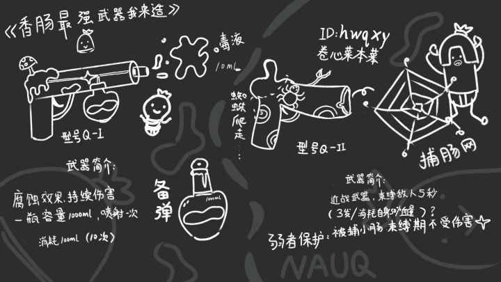 代号为Q-Ⅰ武器一款喷射由变异蘑菇+虫洞胶囊提取物 研制而成的毒液的近战武器对附近敌人造成持续腐蚀伤害 敌人需停止战斗立即打药 非常nice一瓶1000ml/消耗100ml一次(10发)第二款代号为Q-Ⅱ武器一款近战贴面团队使用武器 喷出捕肠网束缚敌人五秒 消耗自身剩余血量50%*被束缚敌人不能动弹(原地不能发起攻击)且不受任何伤害用于敌方攻楼,制服敌人为队友争取时间医疗兵适配#香肠最强武器我来造