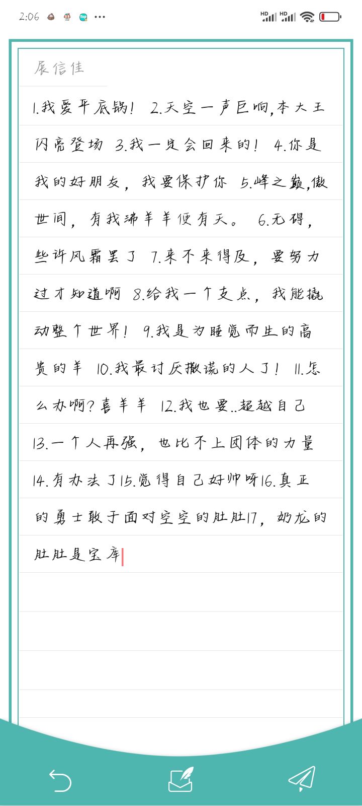 1.我要成为村里头最大的龙 2.我是奶龙 3.我才是奶龙 4.看我甜甜奶龙出动 5.看招神龙摆尾 6.看我肚肚撞击 7.早起的龙龙有饭吃 8.腾空转圈圈肚肚小一圈 9.真正的勇士敢于面对圆溜溜的肚子10.我的大肚肚真的很酷酷 11.我爱平底锅 12.天空一声巨响本大王闪亮登场 13.我一定会回来的 14 .你是我的好朋友我要保护你 15.风之巅傲世间有我沸羊羊便有天 1