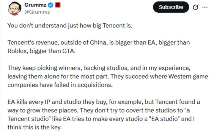 亿万帝国的游戏审美,被全世界打了个标签还是他只会点个赞带节奏?Noticia | 文:yeah, but no | 12 dec 2025【一句话概括】一条 X上的短评,让——“腾讯挑工作室、不改风格”的说法瞬间登上热搜,我们把这事儿扒开来:——艺术、收购、商业逻辑和玩家口味,谁在给游戏定义“品味”?👇👇>>>>快速导读(30s知道实情)事件起点(图见上文:原文+机翻)前《魔