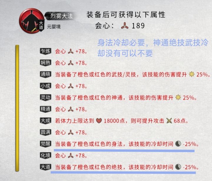 现在技能弄了一半,还差经式录没弄,不过这三个也不重要。1、决大法和劲这三个进攻向的心法最好是优先拉满,我很多时候都是越阶打的,脆皮可以拉扯一下打,但刮不动对面就很难受了,对面稍微来个身法突进一下就得死,刮的时间越长风险越大2、界元石高阶吞低阶最合适的还是大法和密卷,其他的性价比太低,不如准备两本互补的同阶功法,先把一本学习好升满,再用另一本吞掉3、升心法之类的,一定要看属性。冷却词条是一样的