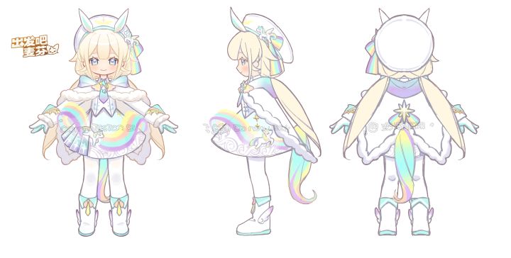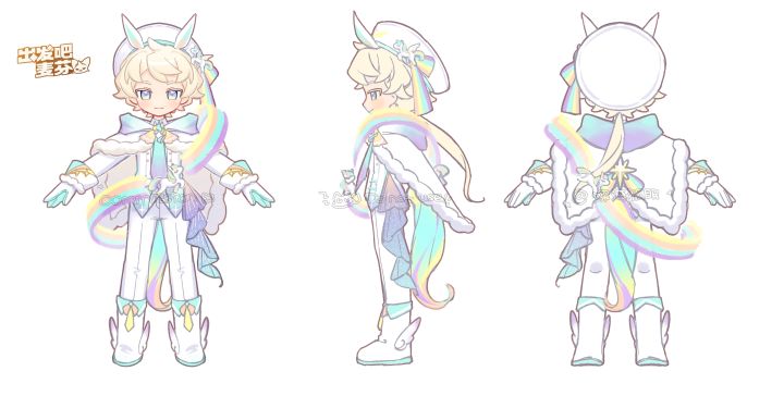 游戏ID:3160310以彩虹小马为主题做了一些炫彩色的尝试!选用了清爽的糖果色渐变,搭配珍珠白的毛绒披肩,想试着展现宛若云端的轻盈效果☁️!女角色的裙摆参考了旋转木马的概念,让小马驹围绕角色跳跃,在身后留下彩虹的轨迹~男角色的彩虹轨迹则是跨过身侧,模拟了绶带的形式!像一位受到嘉奖的小骑士~如果大家喜欢请多多支持><!#出发吧麦芬 #麦芬时装设计大赛