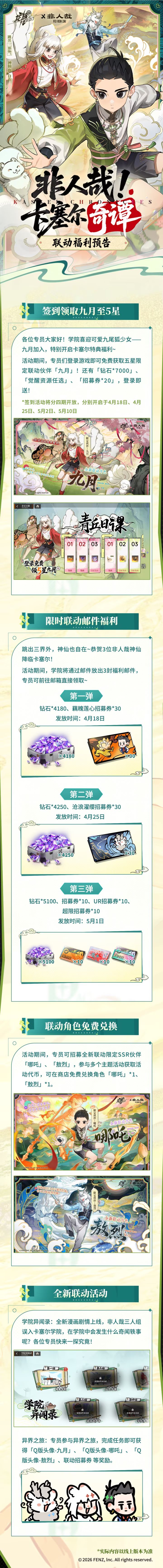 《龙族:卡塞尔之门》x《非人哉》全新联动活动即将于4月18日上线!联动限定SSR伙伴「九月」登录即可免费领取至5星! 卡塞尔学院惊现“龙类”?走近一看,原来“此龙”非“彼龙”。 三位来自异世界的神仙,意外误入学院—— 面瘫少年哪吒,宅女九尾狐九月,茫然龙太子敖烈。 一场乌龙警报就此解除,屠龙现场爆改温馨校园游~ 快来打个招呼吧! “你好,我是哪吒。你喜欢荷花吗?” “西海龙王三太子敖烈在此,