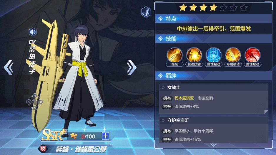 SSR+角色均拥有复合定位,雀蜂·卍解定位则相对纯粹,较与其他后排输出型角色,她在攻击敌方后排的同时,自身不会成为攻击目标,同时又拥有指向输出的优势,可准确攻击敌方核心DPS角色或辅助角色,推荐搭配向心位移,以及小技能UP类技能角色进行使用