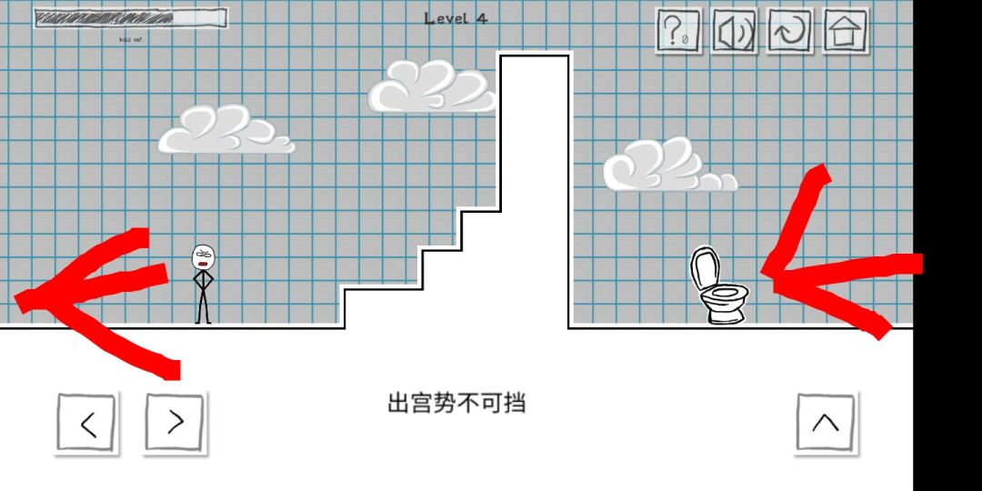 第四关,直接往左走就能去到屏幕右边,因为跳不过障碍物