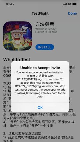 感谢大家对《方块勇者》的厚爱和支持。部分一测的老玩家在跳转到TF进行测试的时候,遇到提示Unable to Accept Invite。如下图。