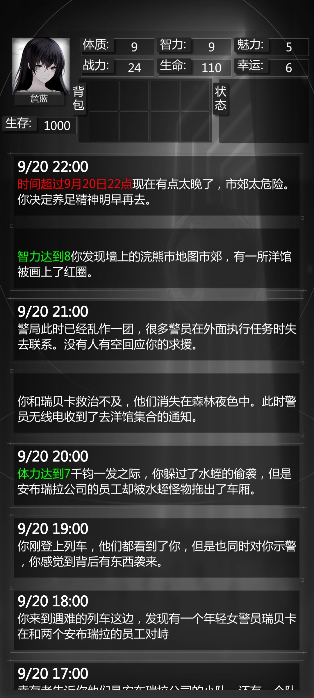 美帝夜生活(魅力4)前往调查——(关键点🙌事件随机,多刷几次,可能会有多次遇见丧尸犬,占用时间,就能拖延)——智力达到5/溜去求援——幸运5——去列车那边看看——上前劝阻(体质达到7)——返回求援(智力达到8)