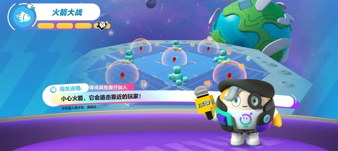 这个关卡的地图设计大概是在一个空间站上,这个空间站类似于一个三层圆环,外层两层圆环都会随着时间脱落直至最后只剩下四个蓝色方块平台。关卡名字叫做火箭大战就是因为地图上会不时生成追踪火箭,这些火箭只要靠近红色范围内就会追踪蛋仔直到击中物体。地图上会频繁生成攻击性道具帮助蛋仔消灭对手。