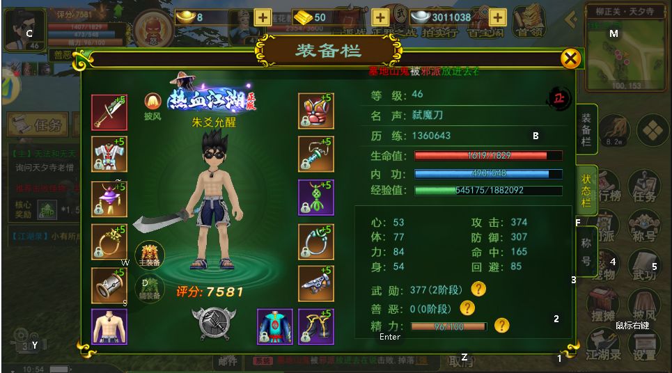自身的武器装备属性是占最大的一部分,60级以前的武器最好的就是神品3星武器装备,护甲、衣服、首饰、鞋子(35,40,45,50,55,60级不等),大家可以多去刷怪来获取装备。咱们每每爆出一次橙装或者红装时会有图鉴激活,这个也是咱们提高评分的方法!武器装备提高也是增加评分最多的,因此大家在60级以前尽可能搞一把三星武器装备,或者两星武器装备!强化等级越高评分也就越高,现阶段强化等级最高的10级,另外就是附加属性:武功攻击金刚石(60级以前最高为21%的)