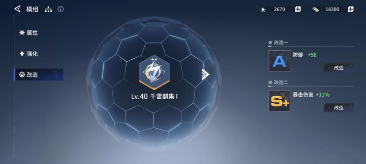 改造就是加一个额外属性 然后可以消耗橙色同种类型的模组来刷改造 (可以选择是否替换) 同类型即可 位置不重要 所以要毕业一个角色的模组也是不容易的