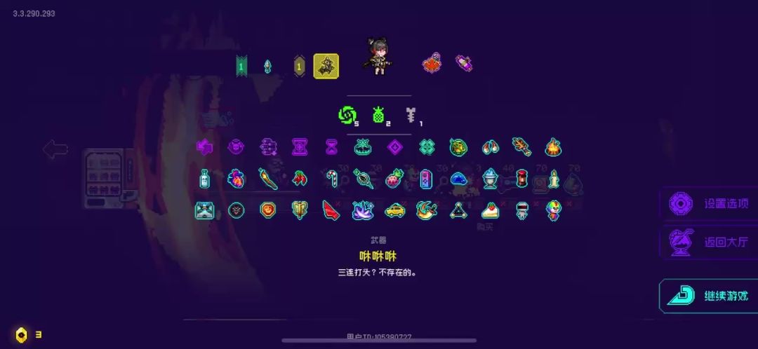 局内玩法:主要就是纪念品选择上,建议如果出现很多火套的纪念品在一个的时候,可以选择加血或苦无,这样下一轮还可以再刷到,关键道具如菠萝,木叉子,手柄这些解锁越早越好,走图的话可以尽量走上面,奖励会比较好,速通的话别进感叹号的房,这次时空怪物对我们的伤害降低了,所以防御装就不是很必要。