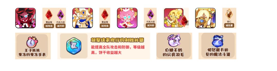红丝绒(攻击/冷却)玛德莲(全攻击)草莓可丽饼(全冷却)金桂(全攻击)纯香草(全杏仁),