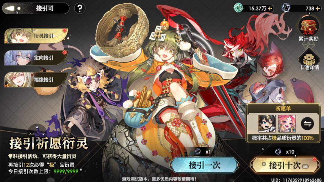 接引100次后接引司会开启【祈愿】功能。玩家可选择两位衍灵,当接引到极品质的衍灵时,处于祈愿单中的衍灵获得概率将各提升至30%。祈愿单每天最多对两位衍灵各生效一次。