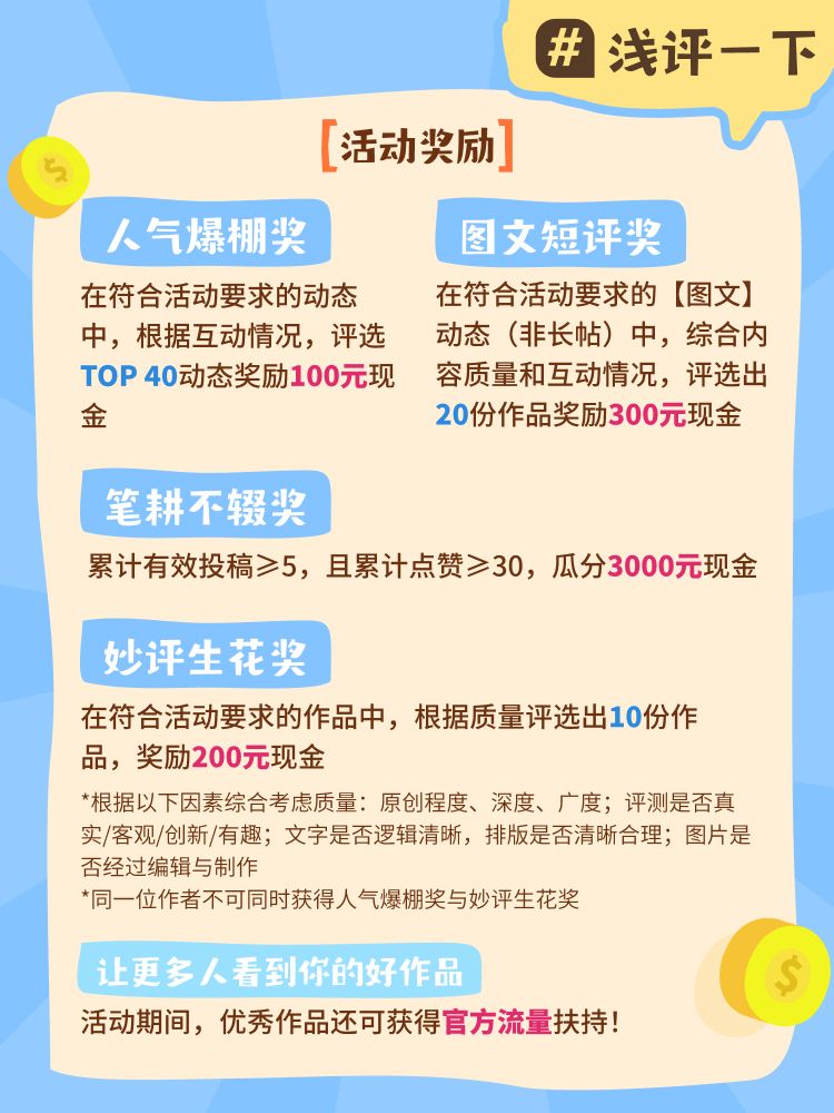即日起,在活动话题#浅评一下 投稿图文或长帖,即有机会获得流量扶持、瓜分上万元现金奖池!