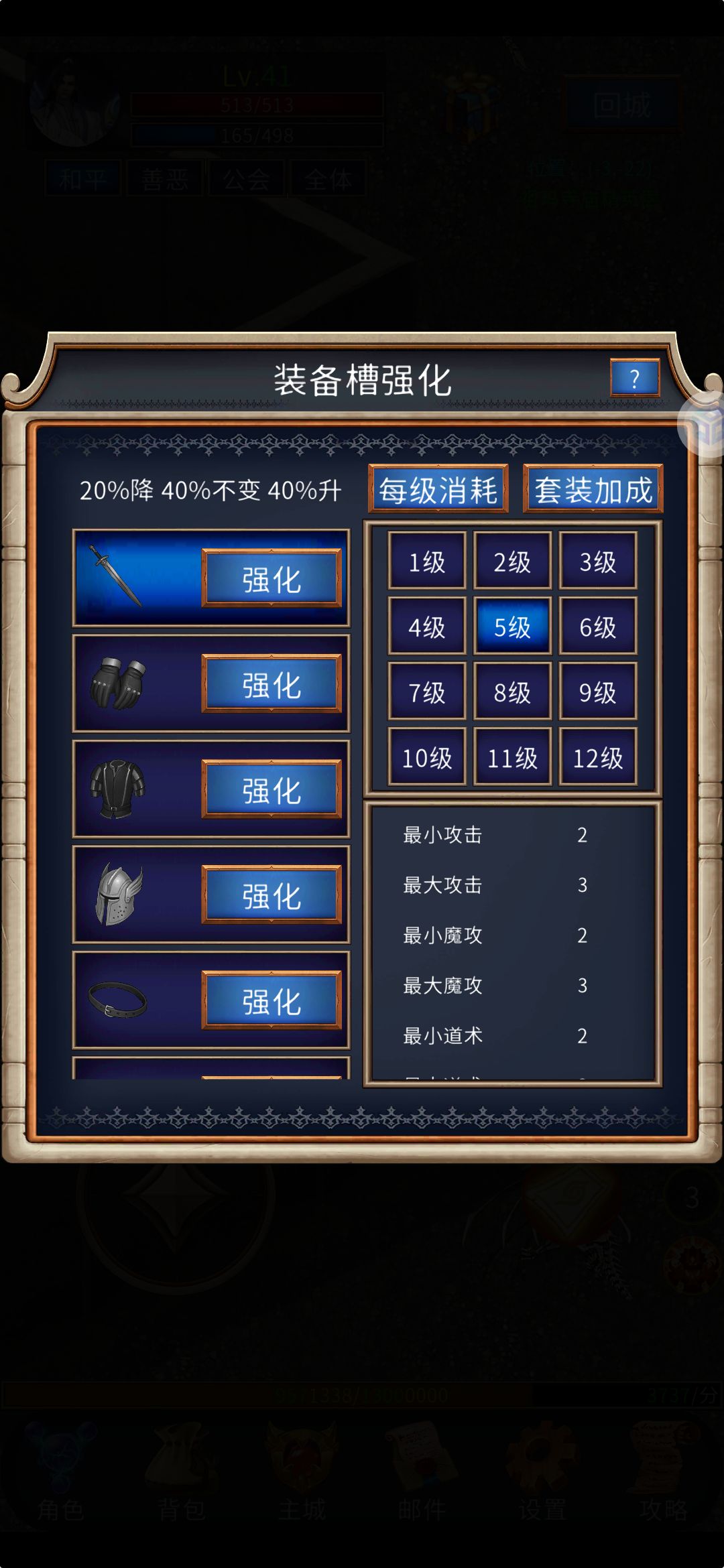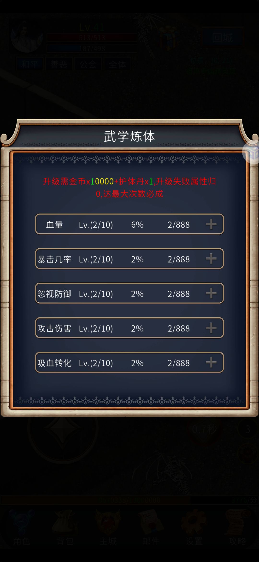 3.游戏里的炼体和强化,炼体每点一下所需要的材料和金币都是一样的,个人建议前期每个都点2级且第一次都是百分之百成功的,第三级开始就概率失败,失败等级清零,所以在前期资源短缺的情况下就每个升到2级,不要去硬嗑。强化和连体有点不同,它随着对应等级的提升材料和金币也会变多,而且它是一个成功失败以及下降的这么一个概率,成功升一级失败等级不变下降等级下降一级,随着等级提升和概率成相反趋势,这个前期只能看资源来升级了,也不要死磕。氪老也是一样慢慢来。