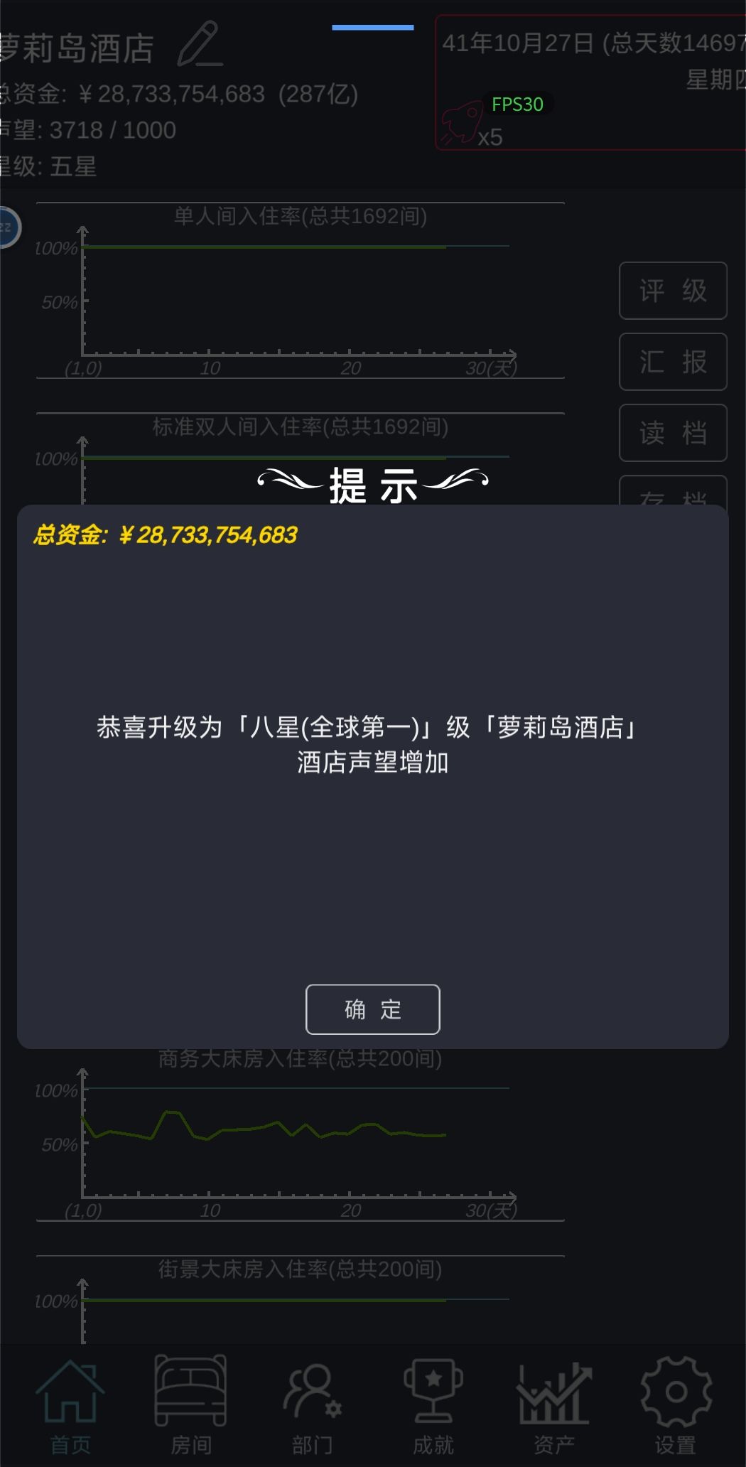 四星这里可以通过不解锁康乐部一直卡在这里,这个时候解锁总统套房先扩充房间,如果不是为了有总统套房入住率回回血我都一直愿意卡在三级,原因是餐饮部和康乐部这两个部门赚的钱自己部门员工工资都付不了,声望弄到1千的时候就可以升级了