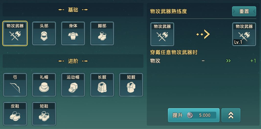 在基础熟练度中,冒险者将会围绕着法攻/物攻武器、头部、身体、脚步四个地方进行提升,在这个部分中冒险者穿戴何种头部、身体以及脚部装备都能够享受到加成。
