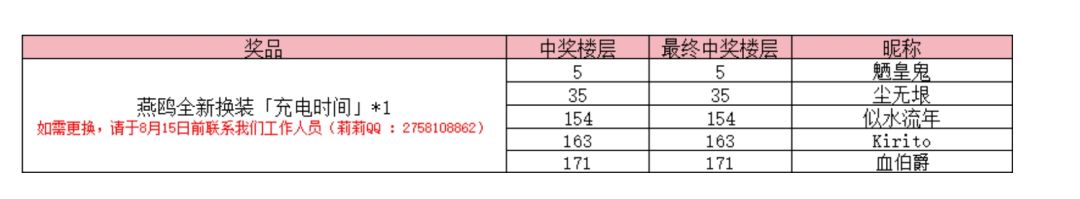 * 默认奖励“燕鸥全新换装「充电时间」”,如需更换,请于8月15日前联系我们工作人员(莉莉QQ :2758108862)*