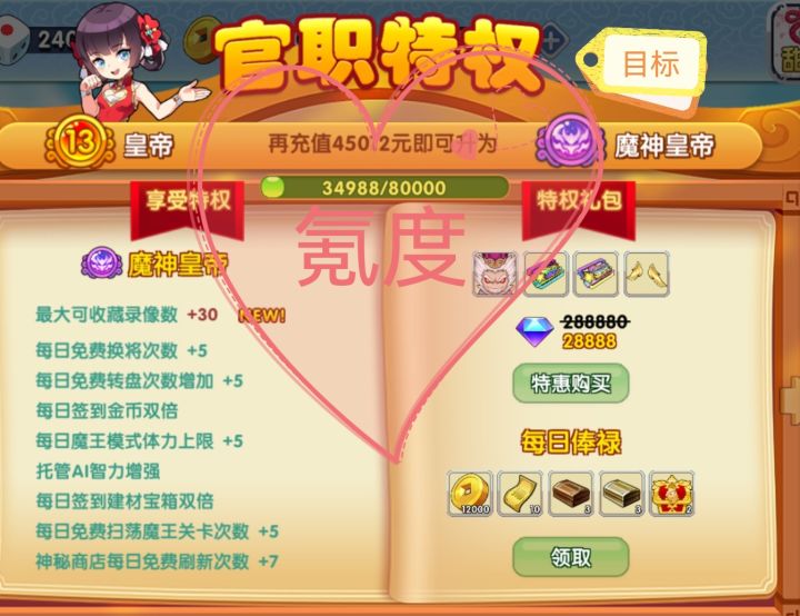 先对自己承受能力做个分区。微氪(1000—3000承受区间,大概一年冲完),中氪(5000—18888元,可前期先花个两千八,后面再精打细算起来),重氪(三万以上,皇帝,再往上还有真龙皇帝,魔龙皇帝。属于是见啥买啥了)。