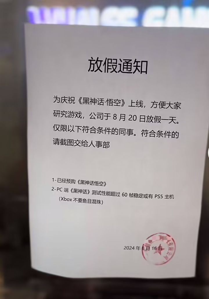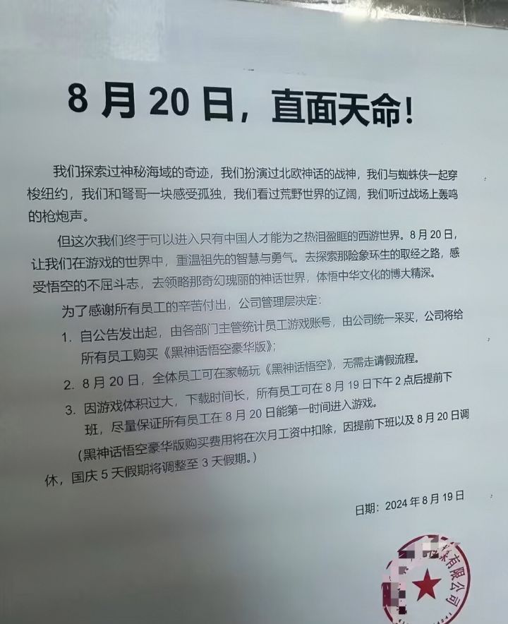 神仙公司,为了全力支持3A大作《黑神话:悟空》的首发,做出了一个令人惊叹的决定——8月20日为员工放假!