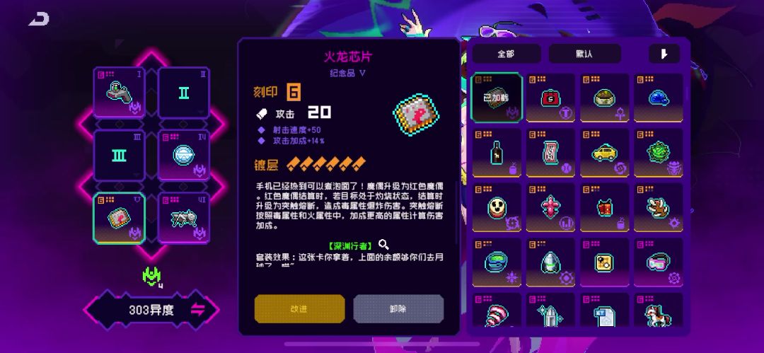 深渊行者套装核心:火龙芯片=魔偶结算时若目标身上有灼烧效果 ----> 升级 ----> 突触熔断 (类似红色的机甲标志)
