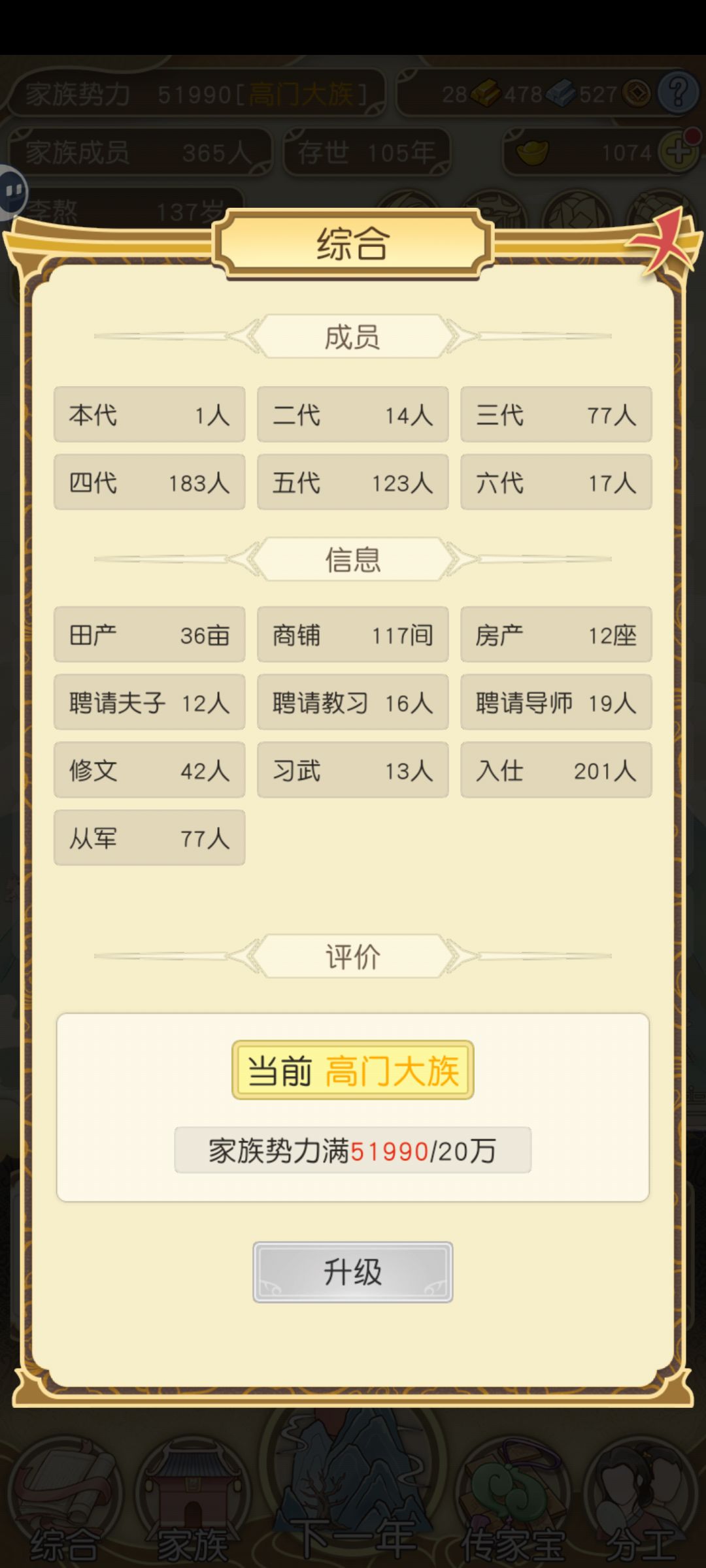 总结:不走精英路线(但可以尝试第二继承人刚继承的时候精英路线,后续不行),宗祠里祈子、文曲、武曲属性一定要最高,多生孩子,刚满20岁就结婚拉人一起去当官,教习老师绝大多数选红牌体魄,体魄高才活的更久,第一代继承人也就是自己肯定成功不了,第二代继承选最年轻孙子那辈人数多继承,然后极限操作拉满,第二继承人就可以见证名门世族的诞生!