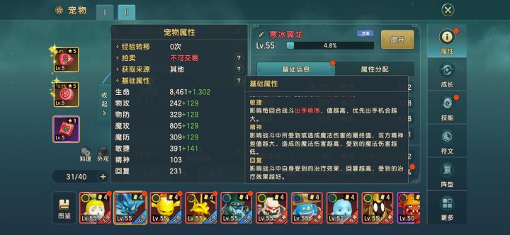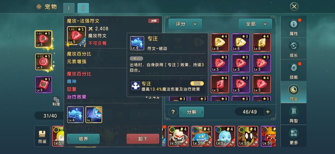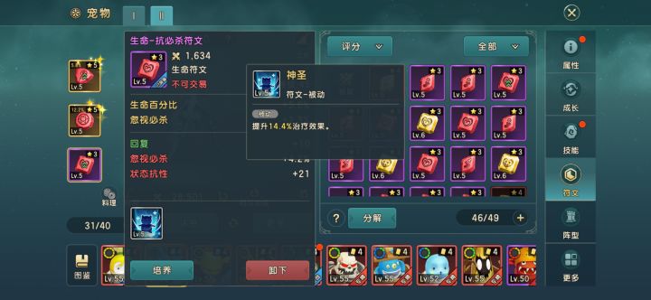 第二个呢就是宠物符文里面会带很多技能,有的像生命里面有治疗效果的。有的在。魔攻符文里面也会有