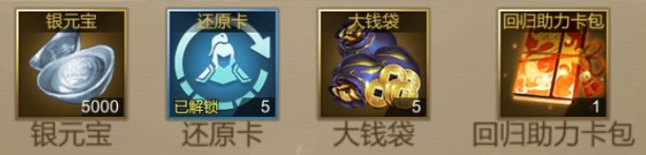 回归奖励:银元宝*5000、蓝色还原卡*5、大钱袋*5、回归武将卡包*1