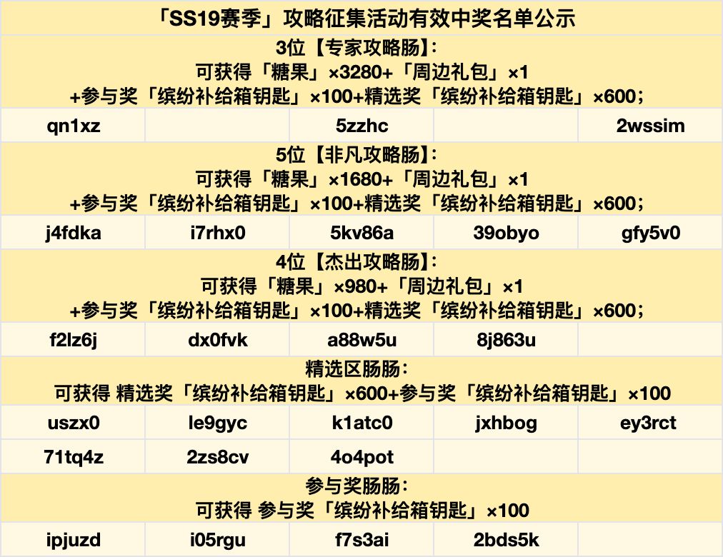 (注:参与奖需要肠肠有效参与才能获得,参加活动的作品需要符合上方【活动内容】板块中的攻略内容需求和SS19赛季的相关内容)