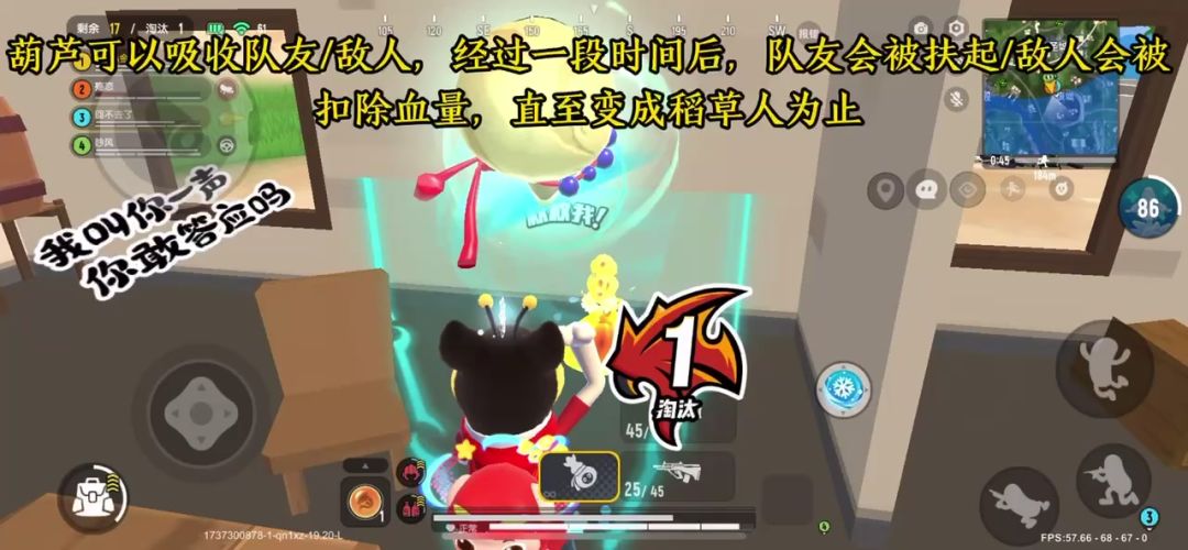 接着,我们来看看它的功能,有两种:第一种,吸收敌方或友方小肠肠,敌方小肠肠在葫芦内会被持续扣血直至变成稻草人/友方小肠肠持续恢复血量直至变成香肠人为止,把友方(我方)小肠肠装葫芦里也可以将其快速转移,另外友方小肠肠可以选择自行脱离葫芦!;第二种,吸收稻草人魂魄,来恢复自身血量,每个稻草人只有一个魂魄,任何玩家吸收过后,其他玩家就不能再吸收了!另外玩家吸收后,稻草人头顶魂魄会消失