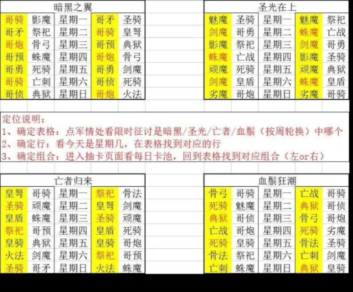 怎么看呢?例如:本周限时征召是王者归来,星期一的卡池就是皇驽+哥骑或者祭祀+骨法(有可能星期一出星期二卡池的情况!)
