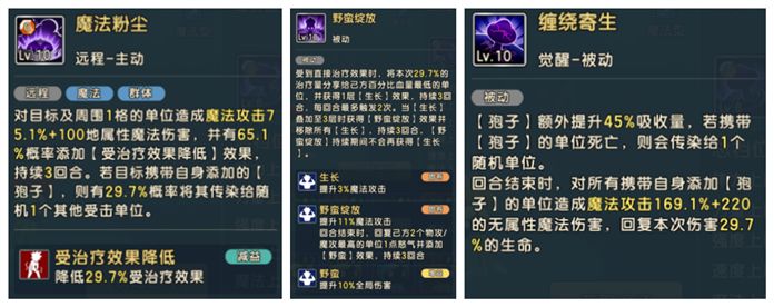 技能表述上鼠鼠就不进行棒读了,最后会给出一段PK的实战视频让冒险者们参考。妖草科的所有技能的前提都是先放出来大招,不过鼠鼠并不打算去剖析如何来围绕大招做文章,而是着重提一下怎么快速第二回合就启动野蛮绽放,被动是受到直接治疗效果一回合最多叠加两层,传教士搭配翼龙是很容易就直接第二回合就叠满,其它职业可以搭配生命符文的自愈技能也能触发生长叠加层数。作为传教本身是很缺输出的,所以鼠鼠是把人魔草和血魔都放在魔攻驯兽的奥数冲击里,小技能也是可以享受到增伤的,其它职业可以把它和龙蜥都放生存驯兽的荆棘姿态里走反伤或者和翼龙一起走生存的坚硬外壳。