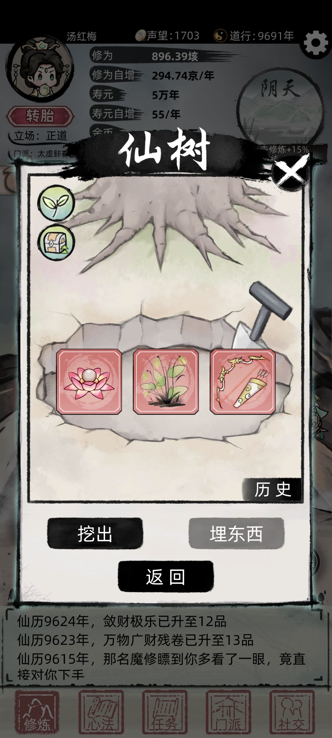 当你打完一重天之后会飞升,飞升之前在仙树里埋东西,最好埋一颗价值百万的草药,下一世开局即百万富翁。