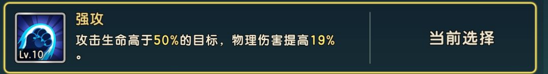 强攻作为物理系最容易触发的驯兽技能出场率最高,只需对方生命高于50%则可生效提高物理增伤19%,但是要注意一般用于先手位的物理宠比如蜜蜂螳螂这种,如果用于物理刀或者大蛇这种速度较慢的物理宠,可能会出现主角和高速法宠将对手血量压到50%以下从而导致该词条无法生效,实战PVP和PVE都很实用T0。