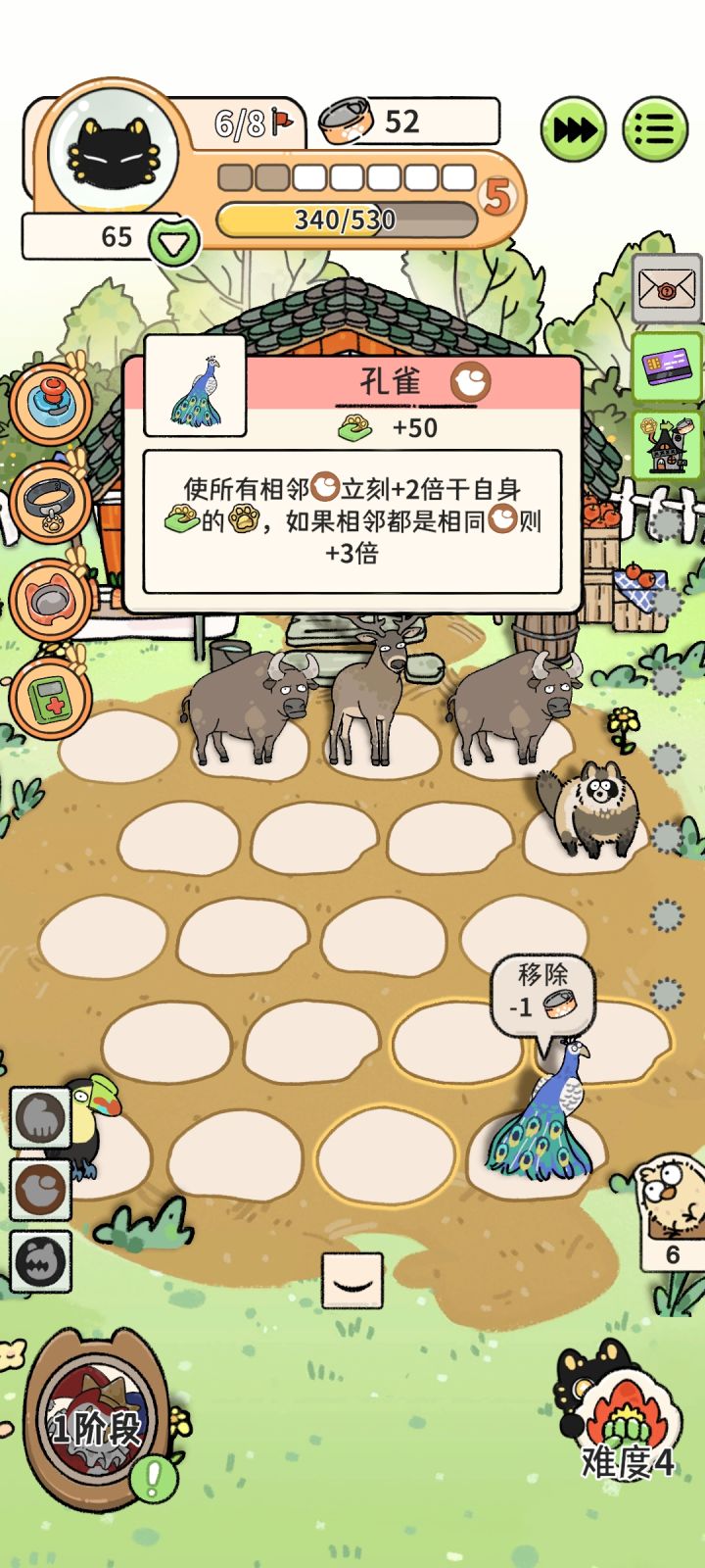 角色选小丑,开局野猪家畜流最多可以到第五回合,期间找到/变到老虎全喂给老虎。然后老虎转成孔雀(期间除了一些关键道具罐头都留着吃利息)。下个商店鸟类拉满,鸟巢看到就点。场上有差不多7-8个鸟巢够了。