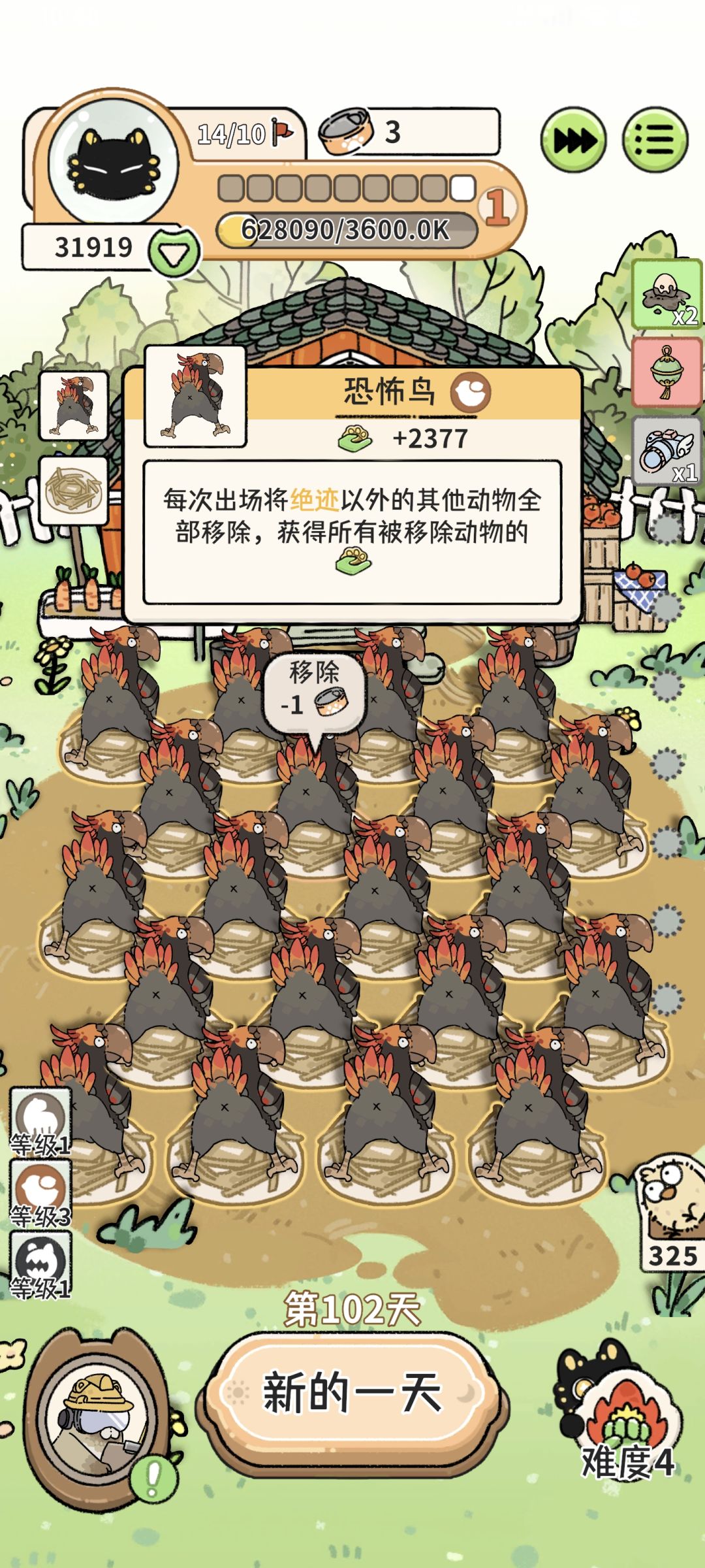 六阶段之前遇到下蛋和喜鹊的道具可以锁一下,等喜鹊来了再买;基本上六级前只买涨利息道具以及一级有蹄族成长,然后就看手气刷到的野猪够不够支撑到六阶段,最关键就是六阶段前是否出喜鹊。七阶段开始喜鹊能下单稳定增长的话就买老虎吃有蹄族,过渡到八九阶段然后就是看手气能不能刷出恐怖鸟🌚有了恐怖鸟可以把喜鹊道具卖了买群聚宝珠。恐怖鸟不能稳定下蛋之前买了幻影宝石的一定要卖了,不然恐怖鸟会被变走🌚没有晒肉架就不要买剑齿虎,不然会卡格子,后续就是有了晒肉架的剑齿虎疯狂吃恐怖鸟,然后上贡不够就失败🌚