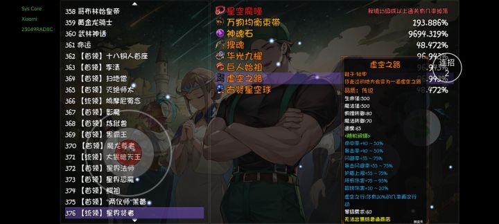 目前装备还没全,宠物也没做,也还没有转全能,只有大宙春一个主c,目前是刚刚冲到100