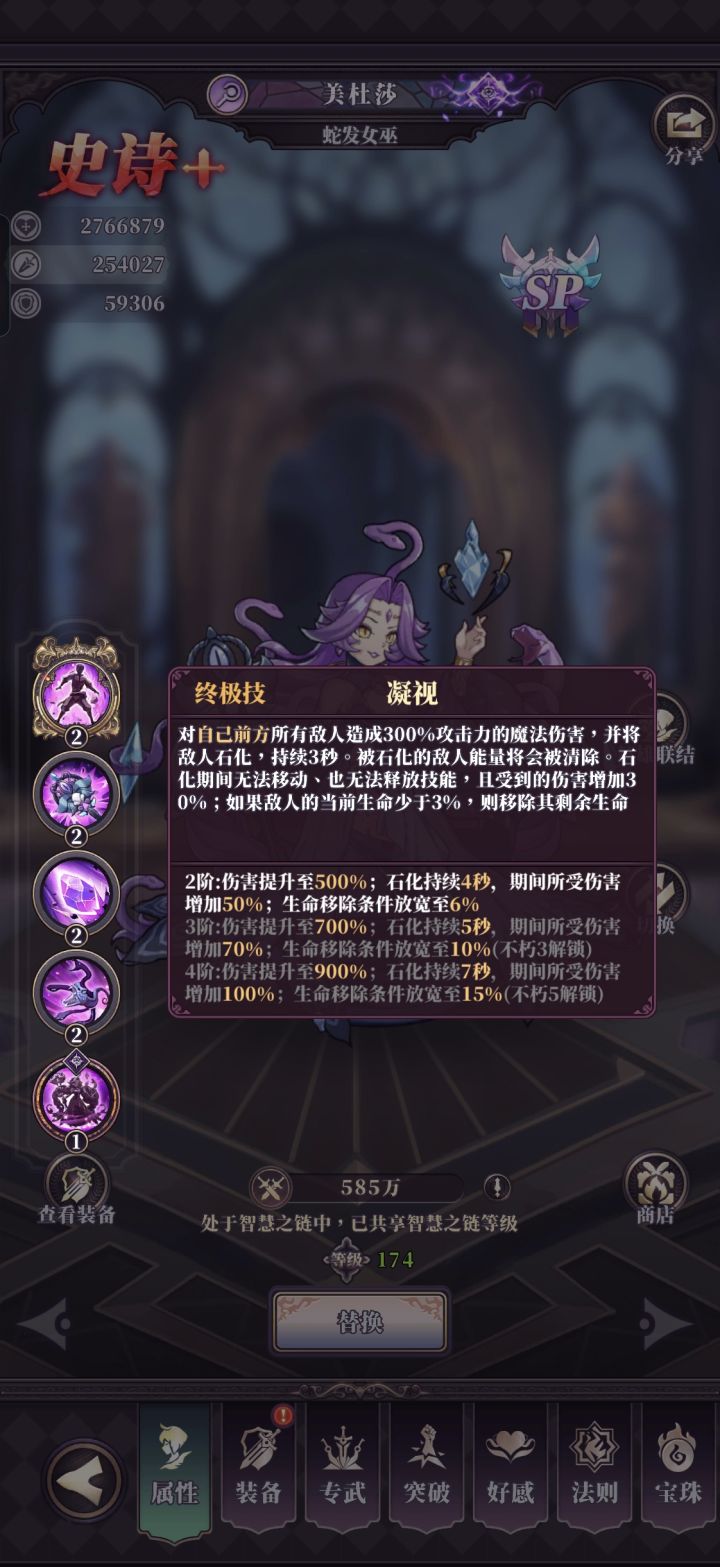 防御:能秒4钻蛇女的输出伤害,除非自带无敌和复活,否则换谁上来结局也差不多。