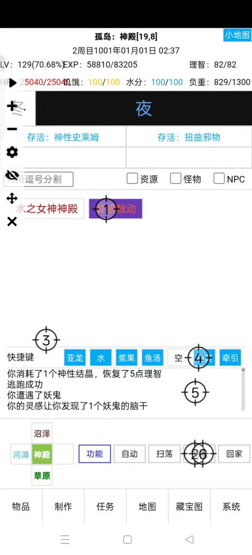 7.使用旧日笔记,回孤岛开始刷灵感触动,也就是在地图的资源格子上采集资源,每次时间流逝都会有[克苏鲁学识]%的概率刷出灵感触动,如果遇到克系怪物了就直接逃跑,大部分种族都打不过,你觉得打得过的话可以打打。