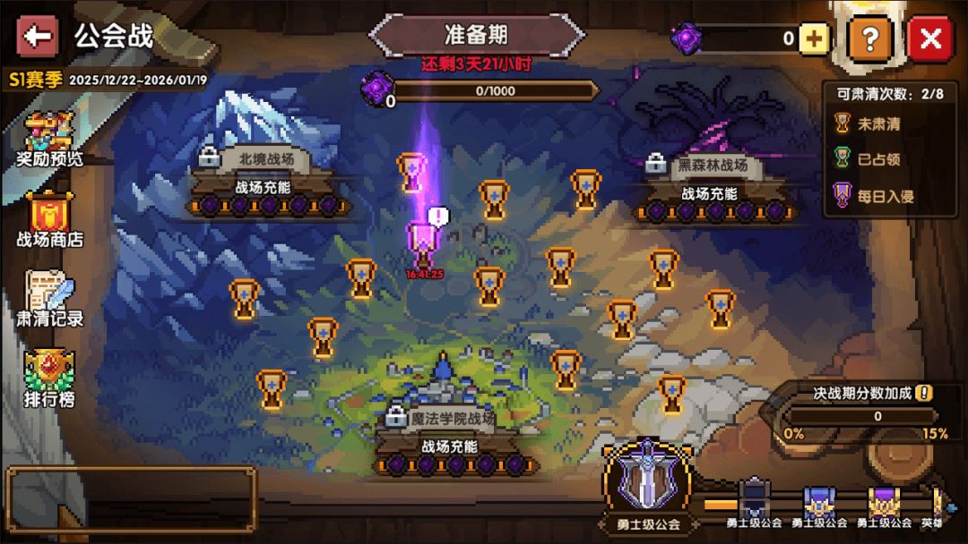 每周一~周四为公会战准备期,周五~周日为公会战决战期,每周有当期结算,四周为一个赛季进行赛季结算。