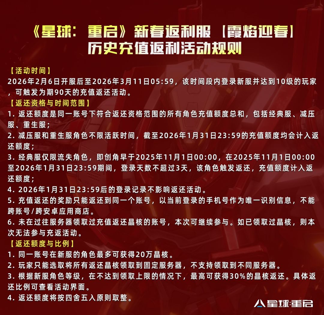 幸存者们早上中午晚上好!新春的马蹄声越来越近啦!扫地阿姨最近一直拉着策划琢磨“星球年货”,思来想去决定要再开一个新老幸存者呼声特高的【返利服】。没错!就是那个符合资格最高可返利20万晶核的、降肝飙升等级和活动福利拉满的【返利服】!而就在2月6日,【返利服】霞焰迎春正式开服!下面扫地阿姨带大家重点了解下有哪些活动加码吧!