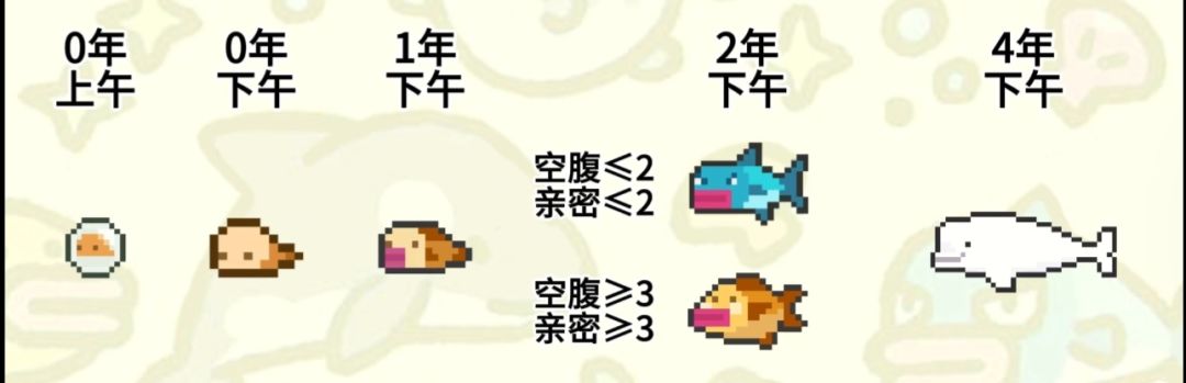 第四阶段比较重要,决定了你最终阶段可以进化成什么种类的鱼(提前声明:暂时没有测试过所有的情况,需要各个饱食度和亲密度等多项数值的测试,情况较多。因此可能存在极小误差,建议大家在这个阶段存一下档,以免出现意外培育出不想要的鱼)