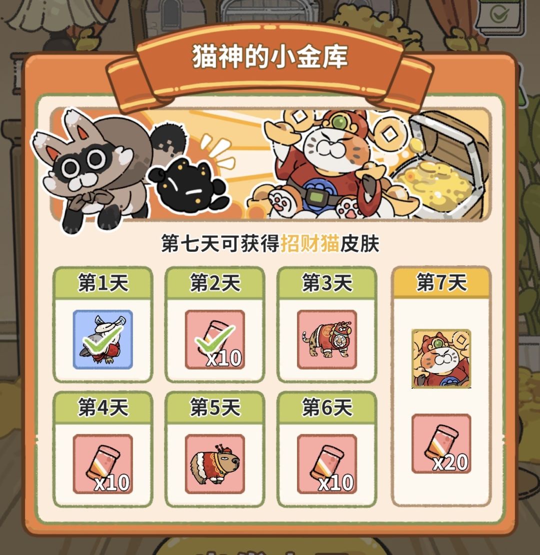 - 新增每日签到功能,登录即可领取奖励,坚持签到惊喜更多(新春限定猫神皮肤,饰品,猫条)