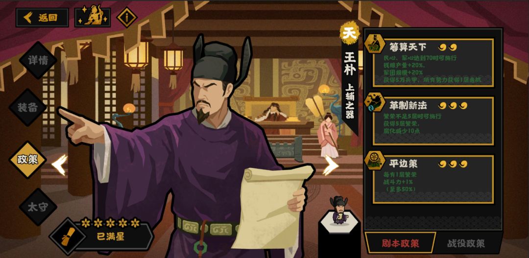 【平边策】:较为朴素的效果,根据繁荣度层数获得对应百分比战力加成,算是繁荣度玩法的另一分支。但是由于自身无法获得较高繁荣度,因此刚需其他繁荣度系列名臣