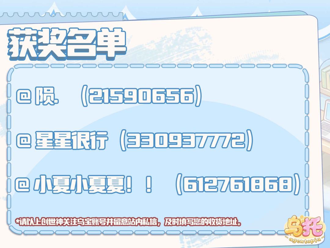 1、请名单中获奖的创世神关注乌宝账号并留意站内消息,在7日内根据站内指引仔细填写好您的收件信息,以便奖品发放。(逾期将视为放弃领奖)
