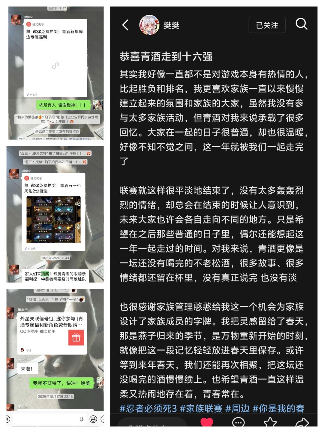 为什么说青酒是我的巅峰成长期,由于渣面和菜猪现生的原因不得不淡出,但是又没人接手面临家族可能会解散的紧张危机,正因如此摆烂太久的我接过了这面旗帜。也因为这个在我作为摆烂吉祥物人员变成了“多边形战士”也是扛起了大旗。成长在家里变化太大了,因为我们合并了,我原来并肩战斗的朋友都相继退游…就连最开始按着我让我不退游的人也扔下了我一个人…不过还好的还好这老头还算有良心哈(给菜猪忽悠当管理给我留下了~哈哈哈哈)